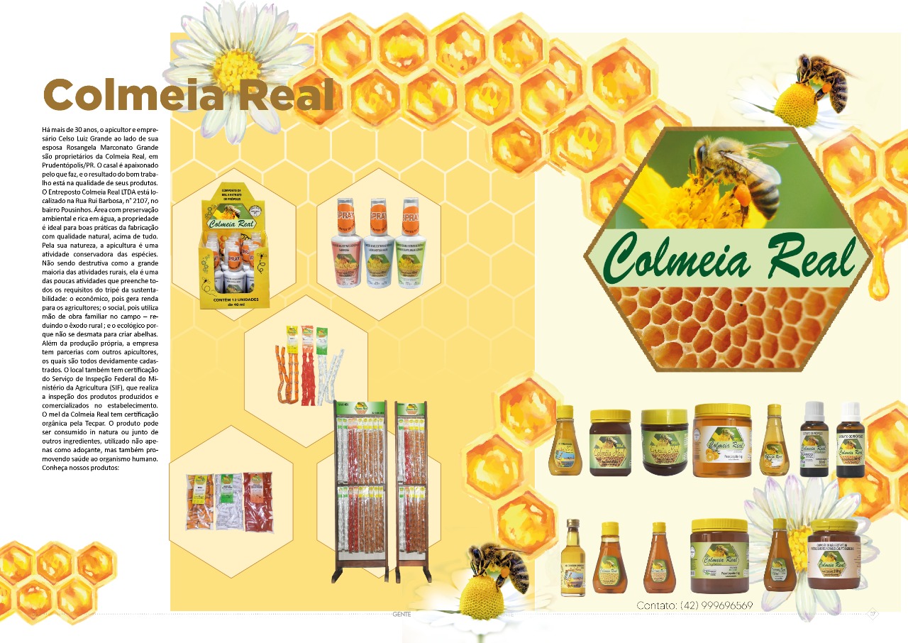 Há mais de 30 anos, o apicultor e empresário Celso Luiz Grande, ao lado de sua esposa, Rosangela Marconato Grande, são proprietários da Colmeia Real, em Prudentópolis/PR. O casal é apaixonado pelo que faz, e o resultado do bom trabalho está na qualidade de seus produtos. O Entreposto Colmeia Real LTDA está localizado na Rua Rui Barbosa, n° 2107, no bairro Pousinhos. Área com preservação ambiental e rica em água, a propriedade é ideal para boas práticas da fabricação com qualidade natural, acima de tudo. Pela sua natureza, a apicultura é uma atividade conservadora das espécies. Não sendo destrutiva como a grande maioria das atividades rurais, ela é uma das poucas atividades que preenche todos os requisitos do tripé da sustentabilidade: o econômico, pois gera renda para os agricultores; o social, pois utiliza mão de obra familiar no campo reduzindo o êxodo rural ; e o ecológico porque não se desmata para criar abelhas. Além da produção própria, a empresa tem parcerias com outros apicultores, os quais são todos devidamente cadastrados. O local também tem certificação do Serviço de Inspeção Federal do Ministério da Agricultura (SIF), que realiza a inspeção dos produtos produzidos e comercializados no estabelecimento. O mel da Colmeia Real tem certificação orgânica pela Tecpar. O produto pode ser consumido in natura ou junto de outros ingredientes, uti lizado não apenas como adoçante, mas também promovendo saúde ao organismo humano.