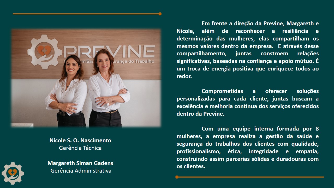 Margareth, fonoaudióloga, e Nicole, engenheira de segurança do trabalho, atuam como gerente administrativo e gerente técnico na Previne, respectivamente. E se existe algo que ambas concordam, é que o Dia Internacional da Mulher é muito mais do que uma simples comemoração. “É um dia para refletir sobre todas as conquistas e desafios enfrentados pelas mulheres ao longo da história. Muitos desafios ainda estão por aí, exigindo esforços constantes, mas é inegável que hoje temos um espaço e um papel reconhecidos na sociedade e no trabalho”, destaca Margareth.